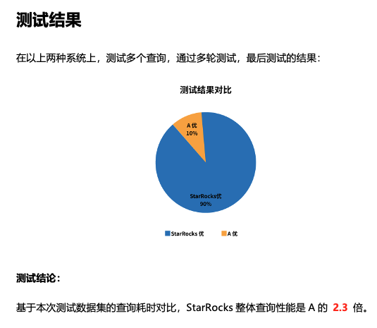 在本地存储和 Hive 外表查询两个场景上,我们基于线上任务做部分抽样,多轮测试汇总均值后的最终测试结果显示:StarRocks 整体优于现有方案,其查询性能达到了现有方案的 2.3 倍。