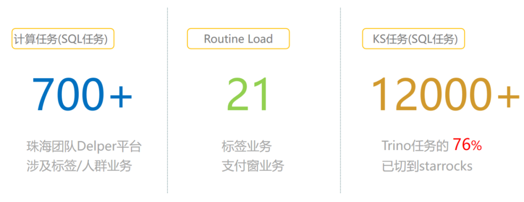 调研的结果充分显示 StarRocks 可以替代我们技术架构中的 ClickHouse 及 Trino,并且在服务维护及计算效率提升上都将有所助力。基于这些发现,我们开始着手将报表计算、人群与标签等关键业务场景迁移至 StarRocks。