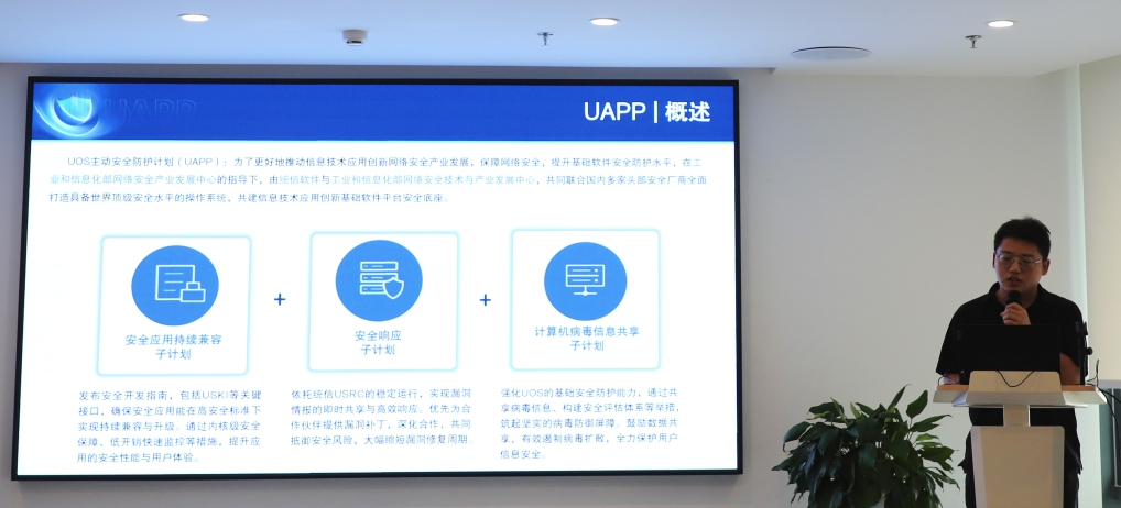 统信软件通用生态部副总经理张宇在交流会上介绍了UAPP并表示,安全已经完全从“被动响应”阶段,进入“主动防御”阶段,统信UOS围绕自身安全、生态安全、供应链安全等三大维度,以平台化为基础、智能化为抓手、创新化为手段、服务化为目的,为生态伙伴提供开放、高效、可持续等确实有力的技术赋能,团结各方力量,推动国产操作系统安全防护能力的持续提升,夯实全栈安全能力,统信软件围绕UAPP三大子计划,已经取得了显著进展。
