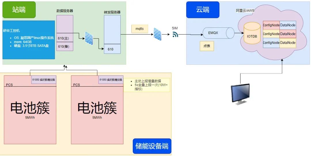 这些数据通过站端转发服务器,使用 MQTT 协议传输至云端,经过 EMQX 的数据转换后,存储至阿里云环境中部署的 IoTDB 数据库,并进一步进行数据的查询、计算与分析。