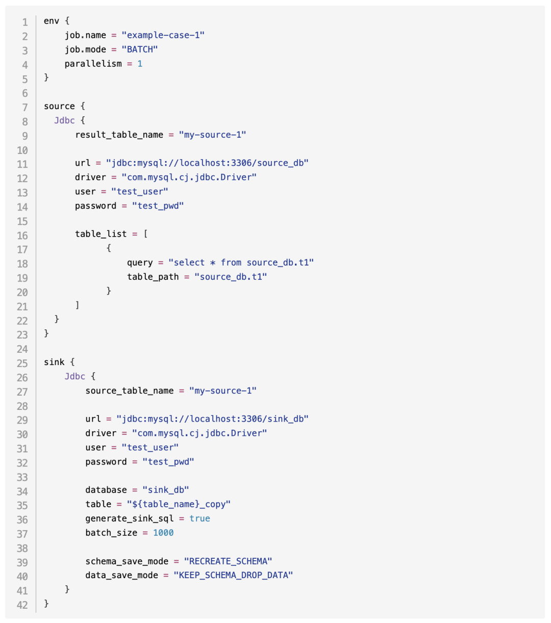ENV:这里包含一些关于job的设置性配置。最主要的配置有两个,一个是parallelism,用于设置任务运行时的并行线程数。如果没有配置,默认是单线程运行;如果数据量较大,可以将其配置为多线程以提高读写速度。另一个是job.mode,用于标识任务是批处理(Batch)还是流处理(Stream)。