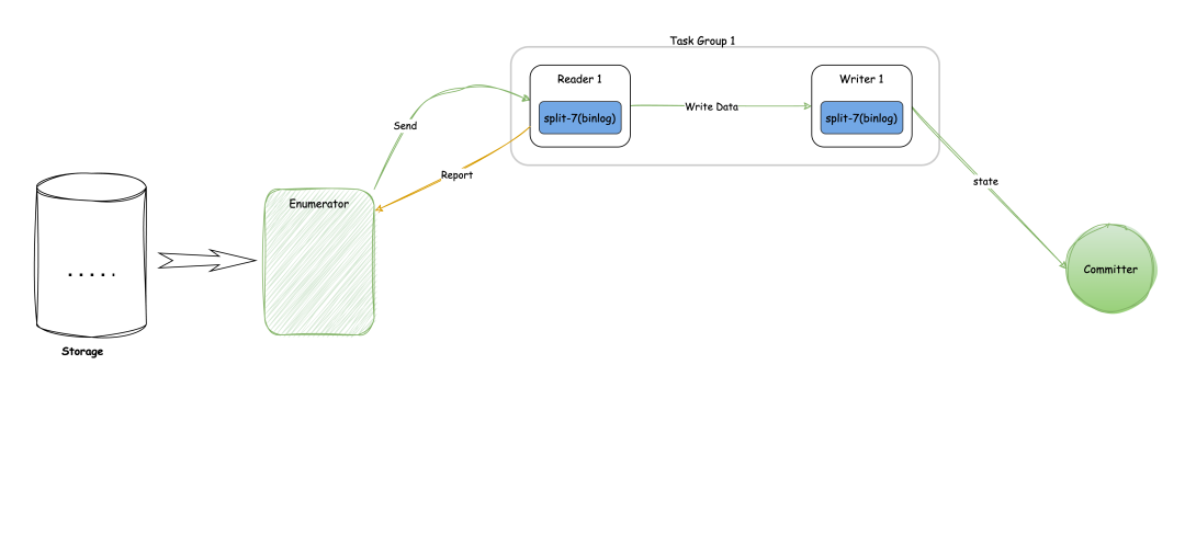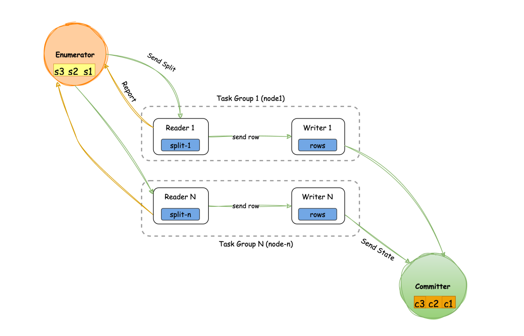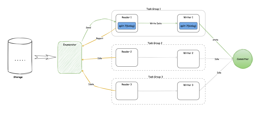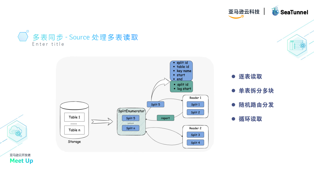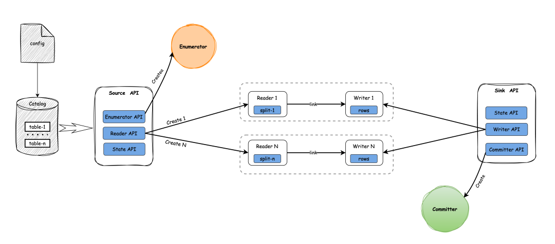 对于Source,通过枚举器(Enumerator)划分数据区块并分配给读取器(Reader),支持动态分配不同的表。