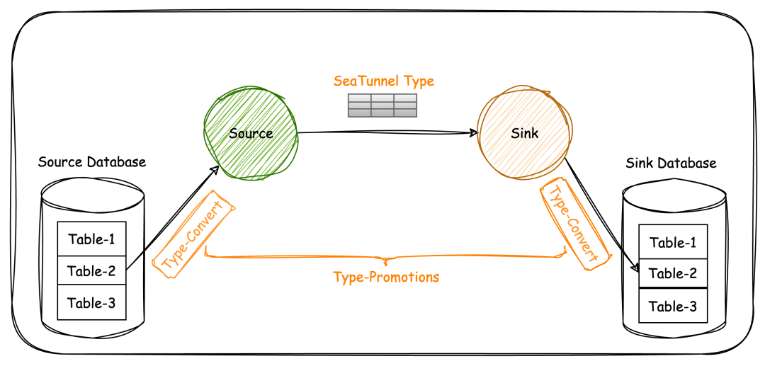 ,Source将外部系统类型导入到SeaTunnel类型,Sink将SeaTunnel类型导出到目标存储类型,实现统一的类型转换。