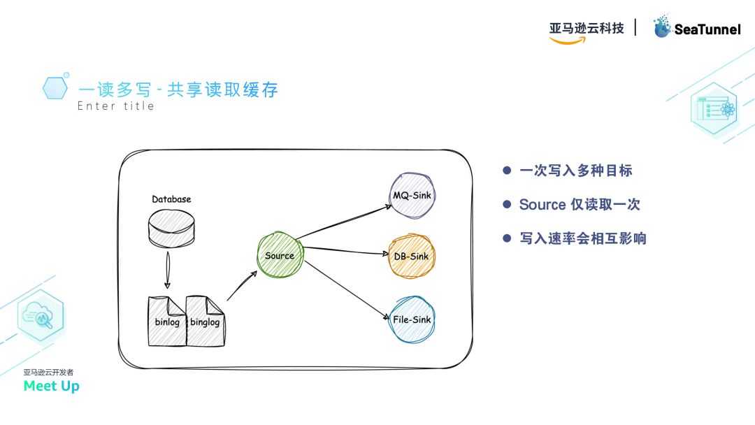 在一些场景中,需要将一个存储中的数据写入多个存储。SeaTunnel通过共享缓存机制,避免重复读取数据。