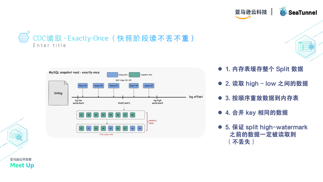 记录水位线:在每个split读取前后,分别记录low-watermark和high-watermark(日志上的水位线)。 比对水位线:读取完成后,比对水位线。如果水位线发生变化,说明数据在读取过程中被更改,需要合并数据并重读。 内存表处理:在读取时,先将数据放入内存表,并按键(key)索引。然后,从日志中捞取数据,并按键覆盖内存表中的数据。这样,即使数据发生变化,按键覆盖也能确保数据的一致性。如果数据被删除,内存表也会同步删除。