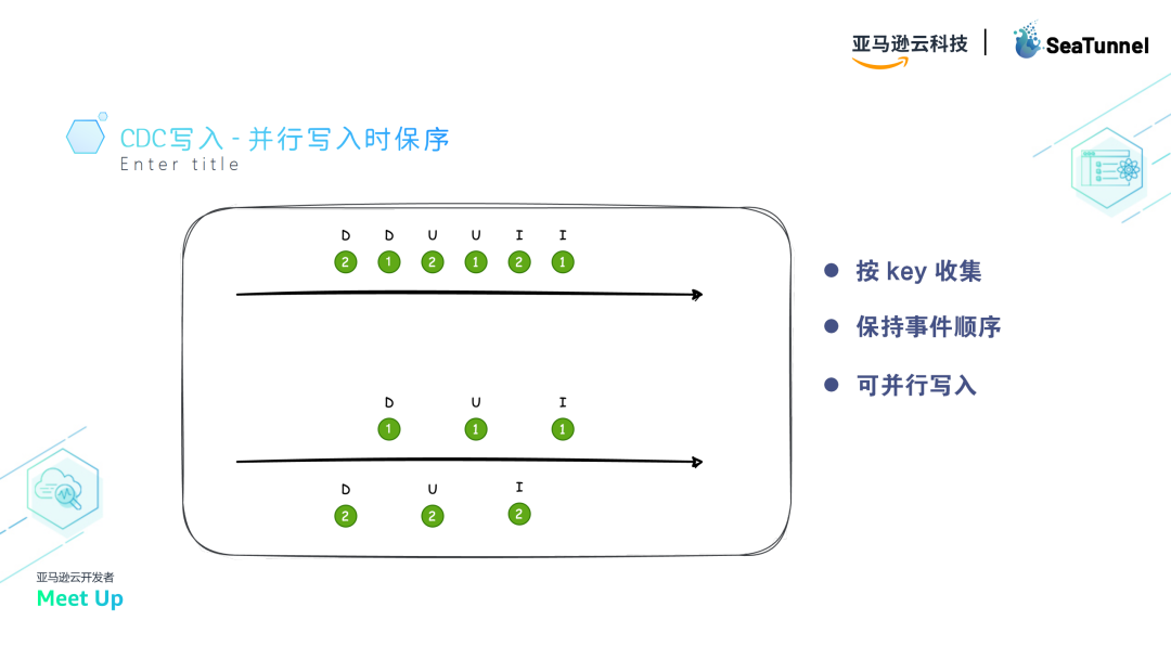 为了解决这个问题,SeaTunnel会将相同key的数据(如insert、update、delete)分配到同一写入线程中,确保这些操作按顺序执行。