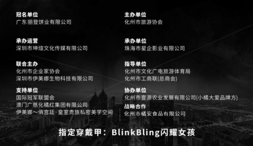 本盛典由广东丽登饼业有限公司冠名,化州市文化广电旅游体育局与化州市工商联 (总商会)指导,化州市旅游协会与化州市企业家协会联合主办,化州市壹源农业发展有限公司(小橘大爱品牌方)协办,深圳市坤煊文化传媒有限公司、珠海市星企影业有限公司承办,战略合作单位:化州市橘安食品有限公司、澳门广慈化橘红集体有限公司支持单位共同开展本次活动。