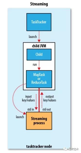Hadoop Streaming的相关源代码可以在Hadoop的Github repo 查看。简单来说,就是通过将用其他语言编写的mapper和reducer通过参数传给一个事先写好的Java程序(Hadoop自带的*-streaming.jar),这个Java程序会负责创建MR作业,另开一个进程来运行mapper,将得到的输入通过stdin传给它,再将mapper处理后输出到stdout的数据交给Hadoop,partition和sort之后,再另开进程运行reducer,同样地通过stdin/stdout得到最终结果。因此,我们只需要在其他语言编写的程序里,通过stdin接收数据,再将处理过的数据输出到stdout,Hadoop streaming就能通过这个Java的wrapper帮我们解决中间繁琐的步骤,运行分布式程序。