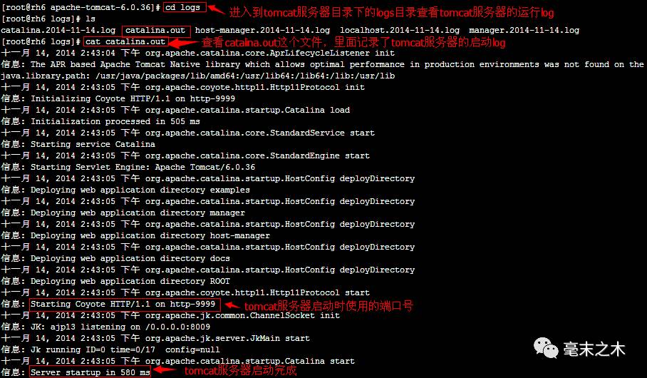 查看tomcat服务器的Log信息,看看tomcat服务器是否已经正常启动,进入tomcat服务器下的logs目录,打开catalina.out文件进行查看,如下图所示: