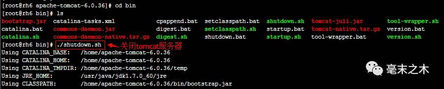 进入tomcat服务器的bin目录,然后执行"./shutdown.sh"命令启动Tomcat服务器,如下图所示: