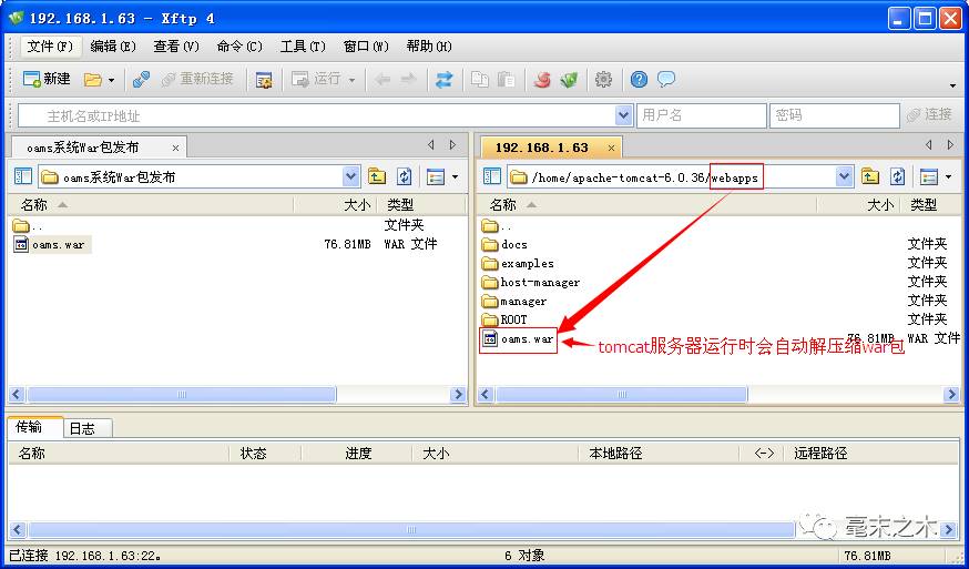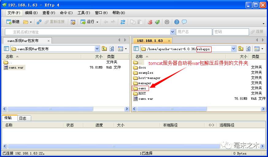 2、将打包好的war包上传到tomcat服务器的webapps目录