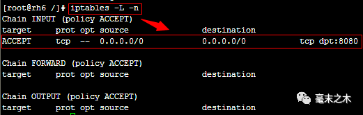 可使用"iptables –L –n"查看当前iptables规则