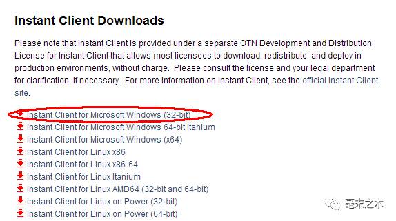 选择第一个Instant Client for Microsoft Windows (32-bit) 进行下载就可以了,请不要下载64bit的,我试过,不能实现连接的。