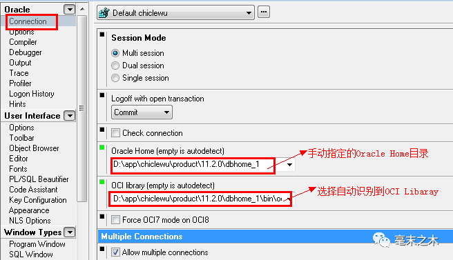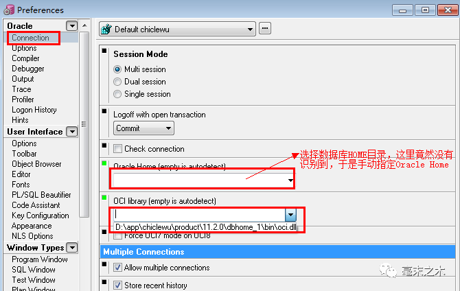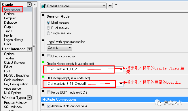 以非登录模式进入PL/SQL Developer,将Oracle Home路径指定为Oracle Client目录(C:\instantclient_11_2),OCI Libaray路径为Oracle Client目录的oci.dll(C:\instantclient_11_2\oci.dll)。