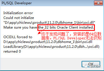 终于找到问题的关键点了,安装的PL/SQL Deleloper只能识别32的oci.dll。看来是要安个64位的PL/SQL Deleloper,于是在网上搜索PL/SQL Deleloper 64位版本。然而发现PL/SQL Deleloper不区分64位和32位。那看来只能从oci.dll入手了。根据上面的报错信息来看,似乎只要安装一个32位版本的Oracle Client。