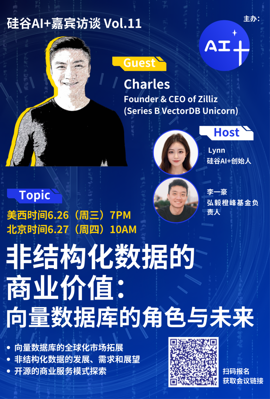 Lynn:欢迎大家参加Google AI+的第11次嘉宾访谈。今天我们有幸请到了Zilliz的创始人Charles来聊聊数据库。让我先介绍一下我们的社群和今晚活动的背景。我是AI+的创始人Lynn。AI+是一个探索人工智能在各个垂直领域落地的AI创业社群。我们现有约2万名成员,包括AI创始人、投资人等。我们举办了一系列AI创投活动,包括深度AI闭门访谈、圆桌会、Demo Day等。我们还协助AI出海项目,关注北美市场和AI产品的全球化。今天是我们嘉宾访谈的第11期。我们想和Charles讨论几个话题:非结构化数据的现状和前景、开源社区和云的现状和前景、如何做开源社区商业化、向量数据库的角色和未来等。现在也请今天的co-host一豪介绍一下自己。