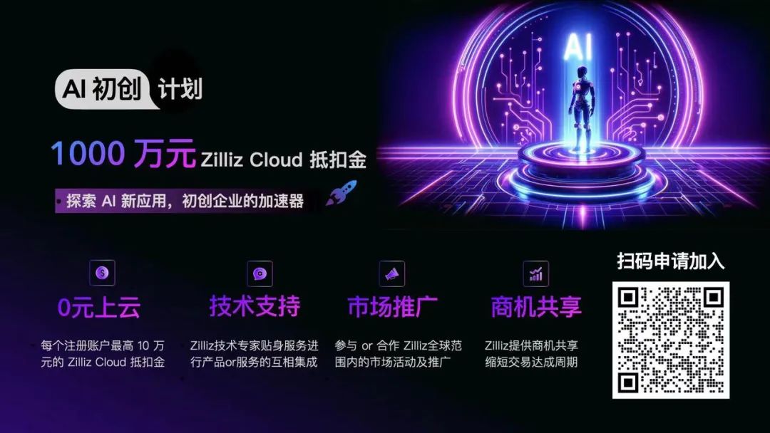 Zilliz发起“AI初创计划”,是面向 AI 初创企业推出的一项扶持计划,预计提供总计 1000 万元 的 Zilliz Cloud 抵扣金,致力于帮助 AI 开发者构建高效的非结构化数据管理系统,助力打造高质量 AI 服务与运用,加速产业落地。