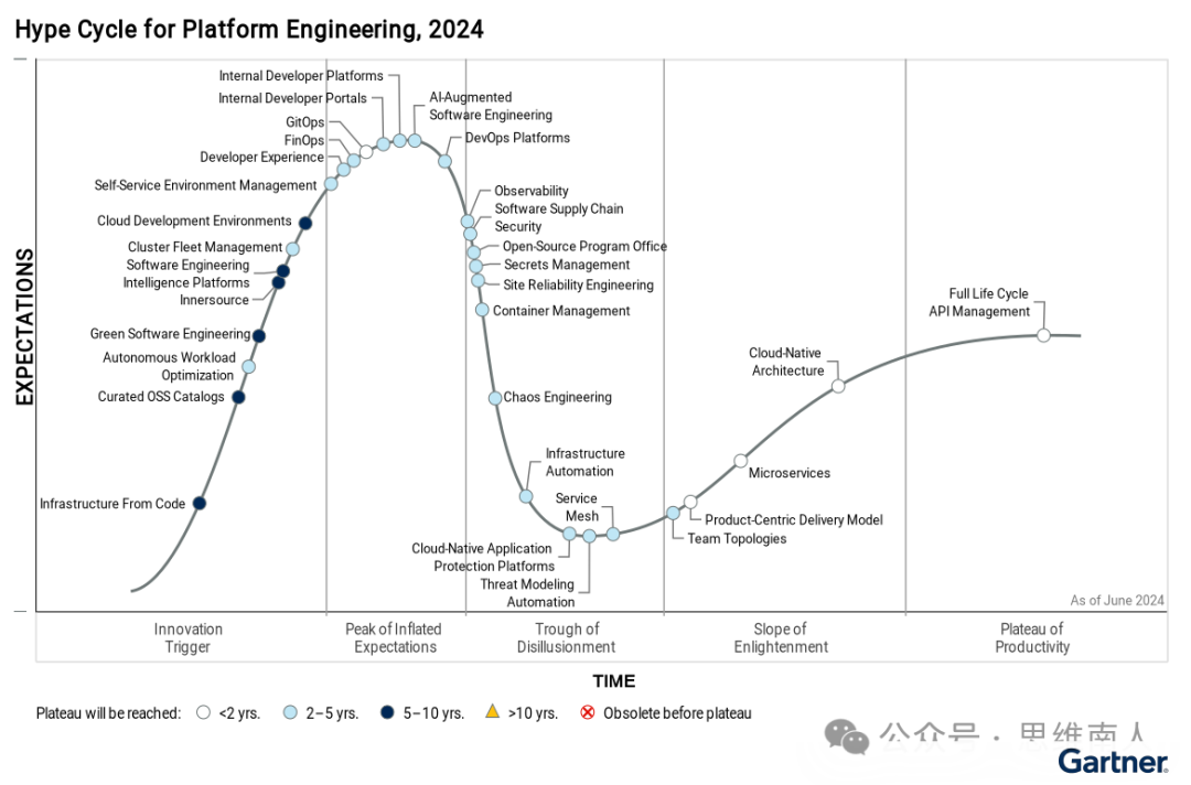 我当时看完,觉得文章逻辑就不对,因为支撑业务单元不一定要优秀技术,很多时候只需要补充业务单元的弱项和空白就行了;然后列出来的反例都是些表象,但这些表象放在不同组织内是否真的都是反例?不同组织架构有不同的资源储备,不同的风险偏好,很多所谓的反例可能是组织刻意为之,而不是错;最后,即使撇开所有的前提,光看业界发展方向,平台工程作为近两年如火如荼重点的新名词、新领域,已成为GARNTER 2024年十大顶级战略趋势之一。GARNTER也于今年6月中发布了平台工程的首个魔力象限(见图一),并推断到2026 年,80%的大型软件工程组织将建立平台工程团队,作为应用交付可重用服务、组件和工具的内部提供商,而基础架构部作为其中的一个重要建设者,反而应该消失???