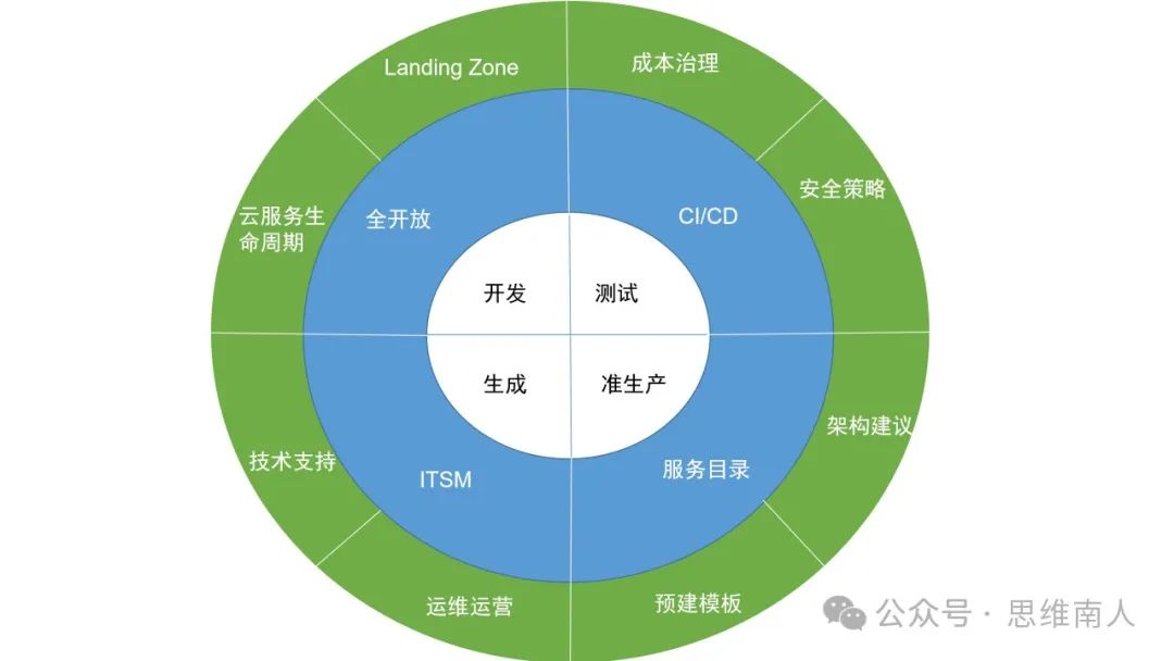 内圈是四类常见的不同环境。中圈是研发人员访问云资源的四种主要方式,管控力度以顺时针方式从松到紧,第一种是给予研发同学直接触碰云资源的完整授权,第二种是研发同学通过CI/CD管道以自行配置IAC等方式直接创建云资源和发布应用,第三种是基础架构部同学封装云资源能力形成限定的服务目录,研发同学以自服务方式获取服务目录内的服务套餐,第四种是研发同学提交工单,基础架构同学异步提供云服务。基础架构部应综合考虑企业自身的风险偏好、安全策略、IT人员技能水平、敏捷和创新需要,对不同的环境设立不同的云资源创建、发布和访问应用策略。而无论哪种环境、哪种云资源访问方式,都需要或多或少的采用外圈那八个由基础架构部提供的治理和运营服务。