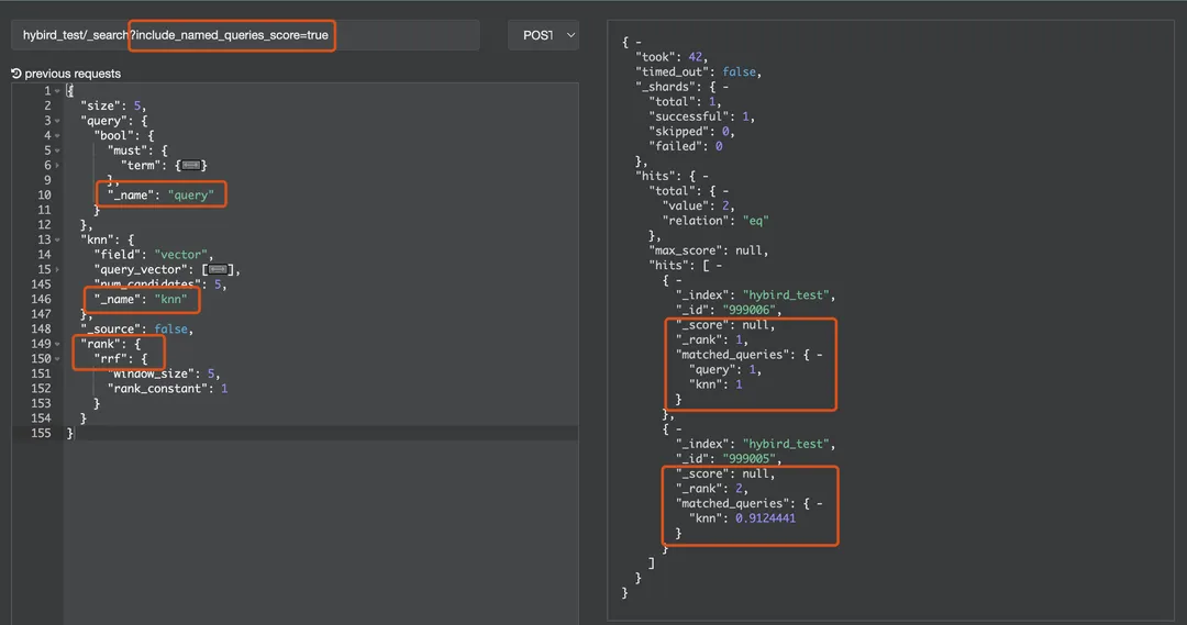 {..."hits": {..."hits": [{"_index": "hybird_test","_id": "999006","_score": null,"_rank": 1,"matched_queries": {"query": 1,"knn": 0.9124442}},{"_index": "hybird_test","_id": "999005","_score": null,"_rank": 2,"matched_queries": {"knn": 1}}]}}