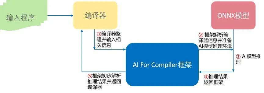 AI for Compiler 框架(AI4Compiler)为编译器提供在编译优化阶段与预训练 AI 模型交互并推理的能力。在编译器内部的优化pass内,编译器将收集的 IR、硬件等信息传递给 AI for Compiler 框架作为输入。框架在解析并预处理信息后,调用目标预训练 AI 模型执行推理,将模型的推理结果解析并处理后反馈给编译器,用于指导相关编译优化手段的实施。当前,本项目已在 openEuler 建仓,由 Compiler SIG 维护管理。