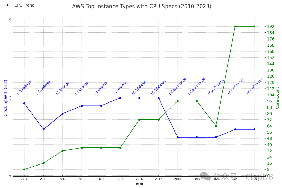 我们前面刚刚介绍了 CPU 发展的趋势。cpu 的单核主频是基本不变的,但是 core 数增加。