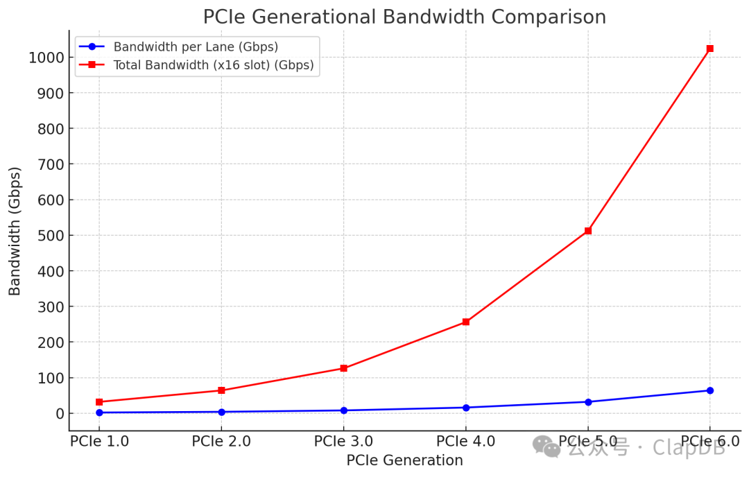 而且服务器是可以配置更多的网卡或者 SSD 磁盘的,就会几倍的放大上面的增量,瓶颈在于总线带宽。下面是 PCIe 总线的带宽变化图。
