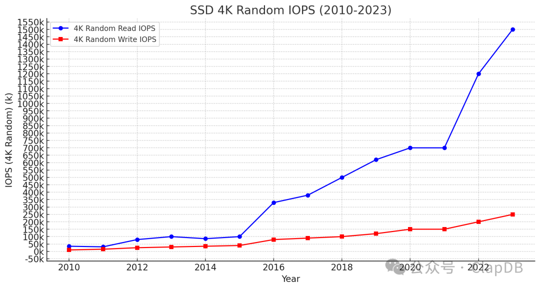 下面是历年发布的 单块 SSD 的 iops 的变化