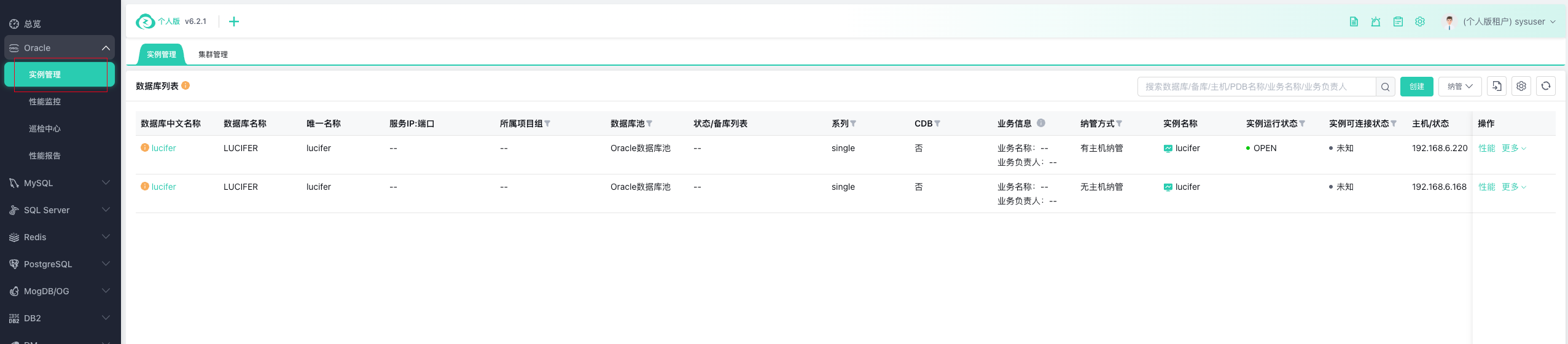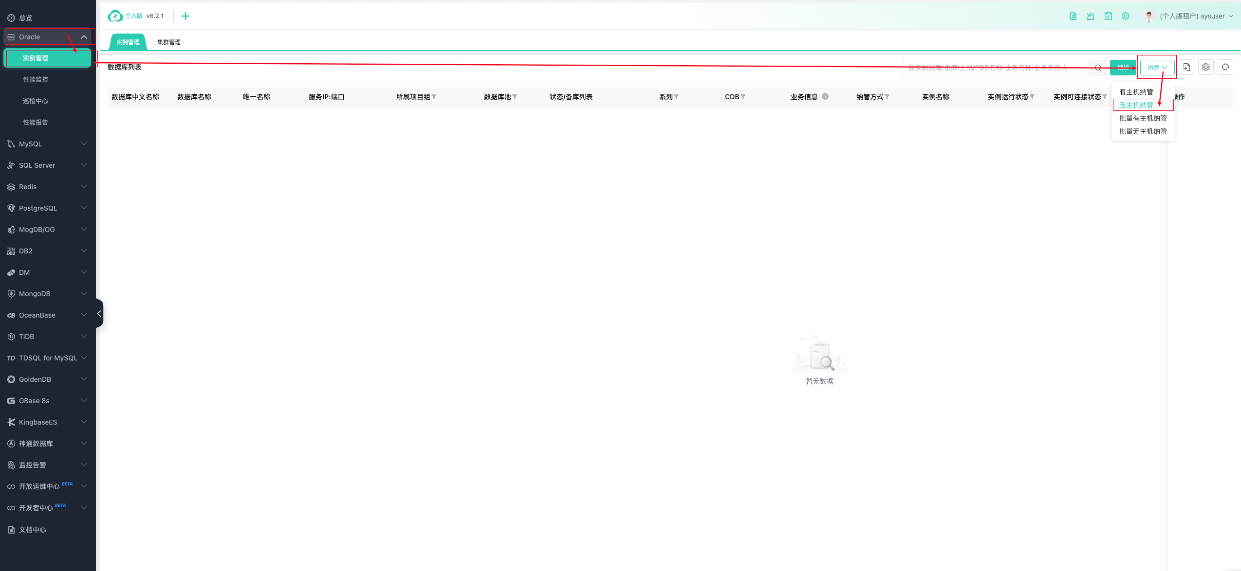 选择【Oracle】–> 【实例管理】–> 【纳管选项】–> 【无主机纳管】: