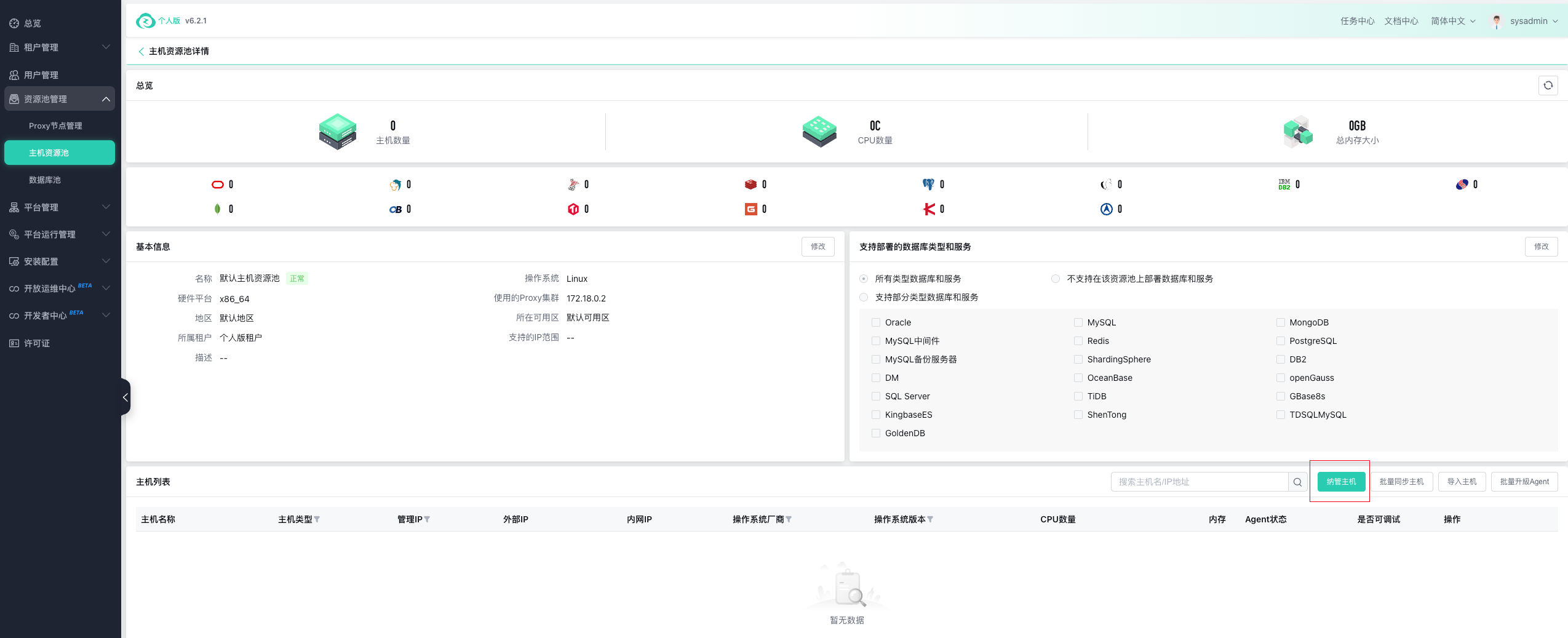 选择【资源池管理】 --> 【主机资源池】 --> 【默认主机资源池】: