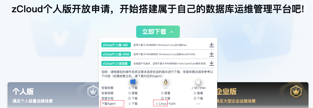 纳管主机需要下载对应平台的 Agent 上传到 zCloud 网页端,这里我选择的是 Linux 主机,所以下载 Linux 的 Agent: