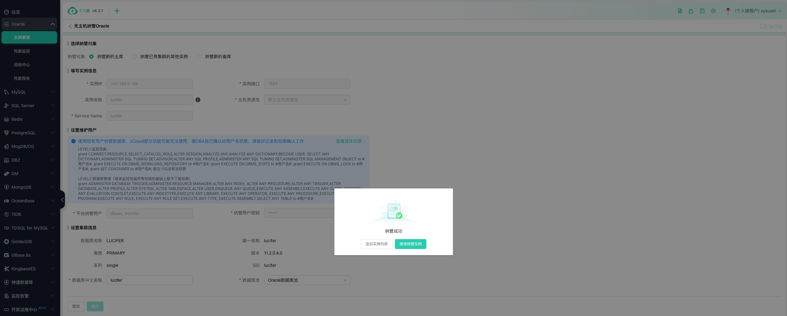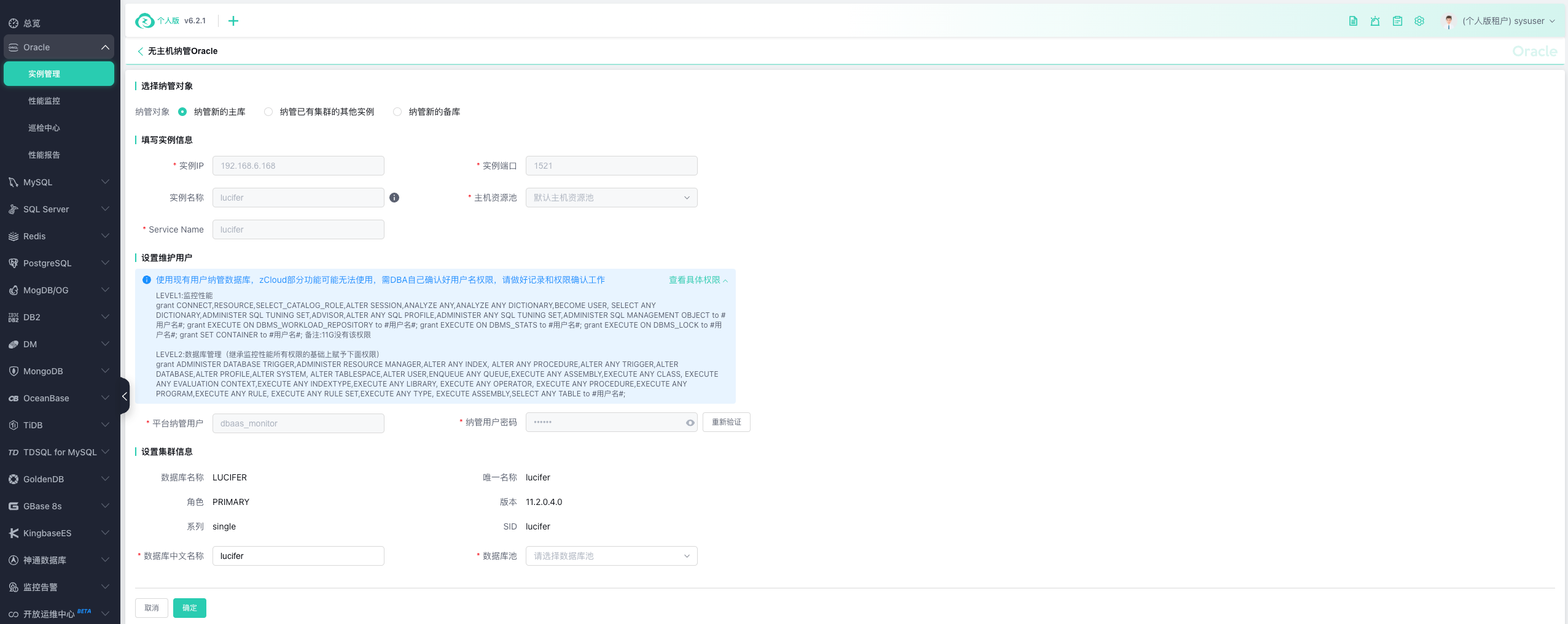 前文演示了如何安装部署:zCloud 个人版 Linux 版安装部署初体验,本文演示如何在 zCloud 上快速纳管一台 Oracle 数据库。