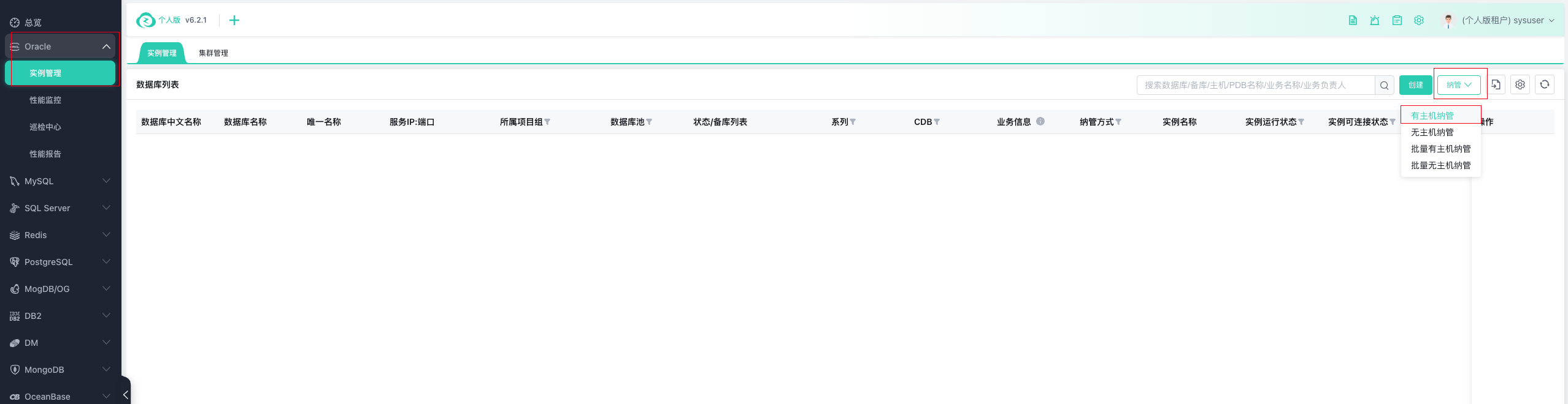 选择【Oracle】–> 【实例管理】–> 【纳管选项】–> 【有主机纳管】: