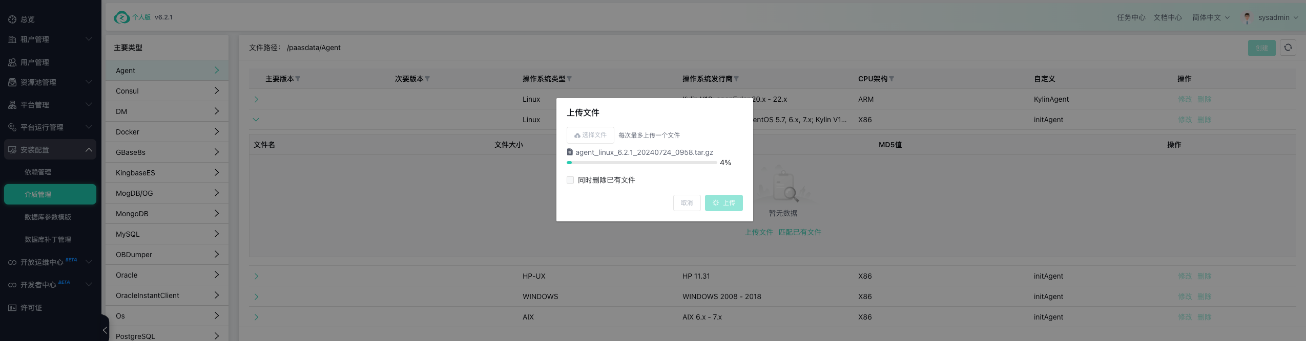 下载后将 agent_linux_6.2.1_20240724_0958.tar.gz 文件上传到网页端: