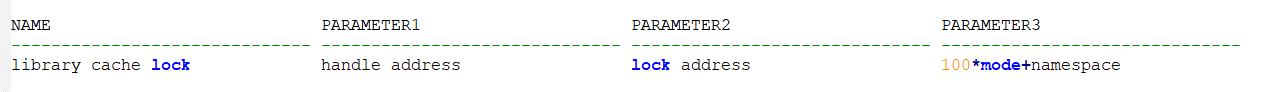select name,PARAMETER1,PARAMETER2,PARAMETER3 from v$event_name where name=‘library cache lock’;