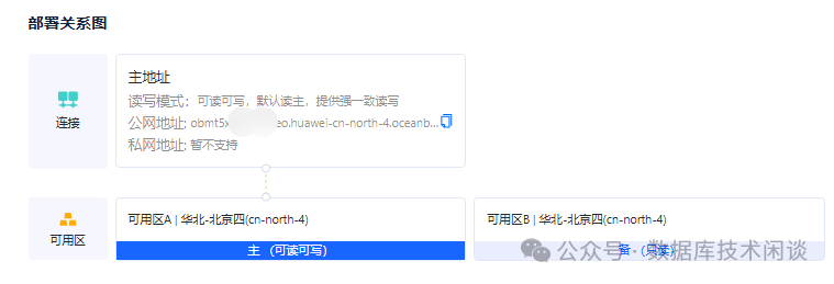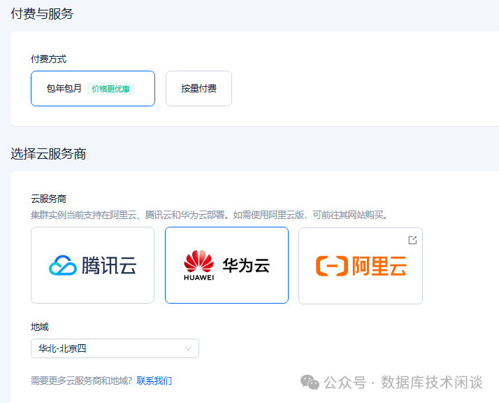 如果是选择【阿里云】,就会跳转到阿里云上的 OceanBase 产品购买页面。选择其他云,就是指定云数据库相关信息直接购买。推测是 OBCloud根据用户的需求去调用云厂商的 ECS、VPC、SLB 等产品购买接口购买主机和网络等相关资源,然后部署一个 OceanBase 集群。OBCloud 数据库在购买的时候需要先确定好机房容灾模式。如果是阿里云上购买,支持单机房三副本部署、双机房两副本部署、多机房两或三副本部署。如果是腾讯云和华为云,则不支持单机房部署。OBCloud 业务除了阿里云外最大的应该还是 AWS。这次没有体验 AWS,主要的功能应该类似。机房在云上为可用区,公有云一般在大城市里有四个以上的可用区。选择哪个可用区还要考虑你的业务应用会部署在哪个可用区。