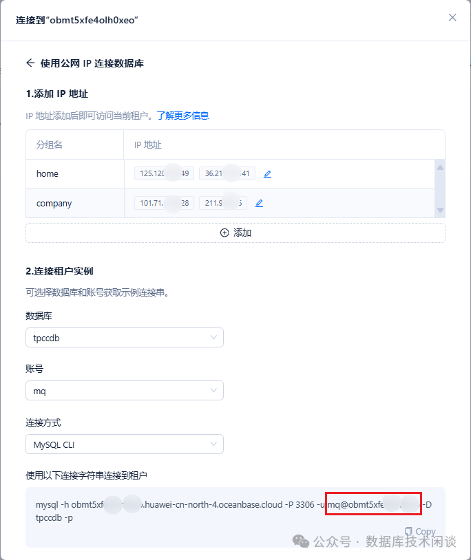 OB 华为云实例的连接方法也是首先要配置云实例的白名单,然后创建租户的访问用户。