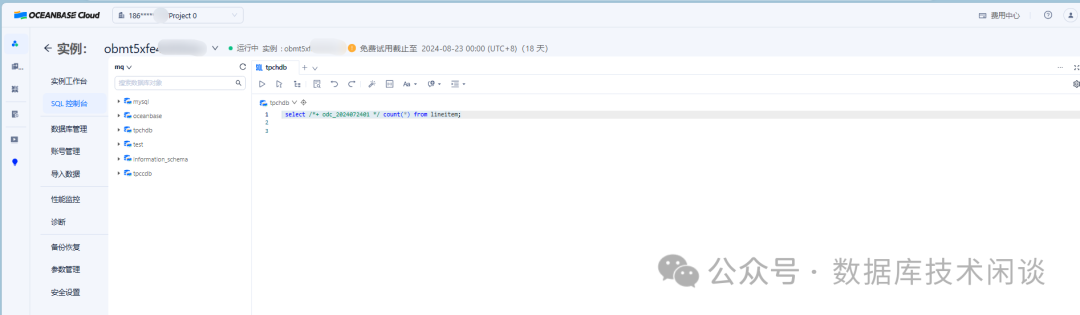OBCloud 实例还提供一个 SQL控制台的功能,其实就是调用 ODC 产品。下面是阿里云 OBCloud 实例里的 SQL 控制台。
