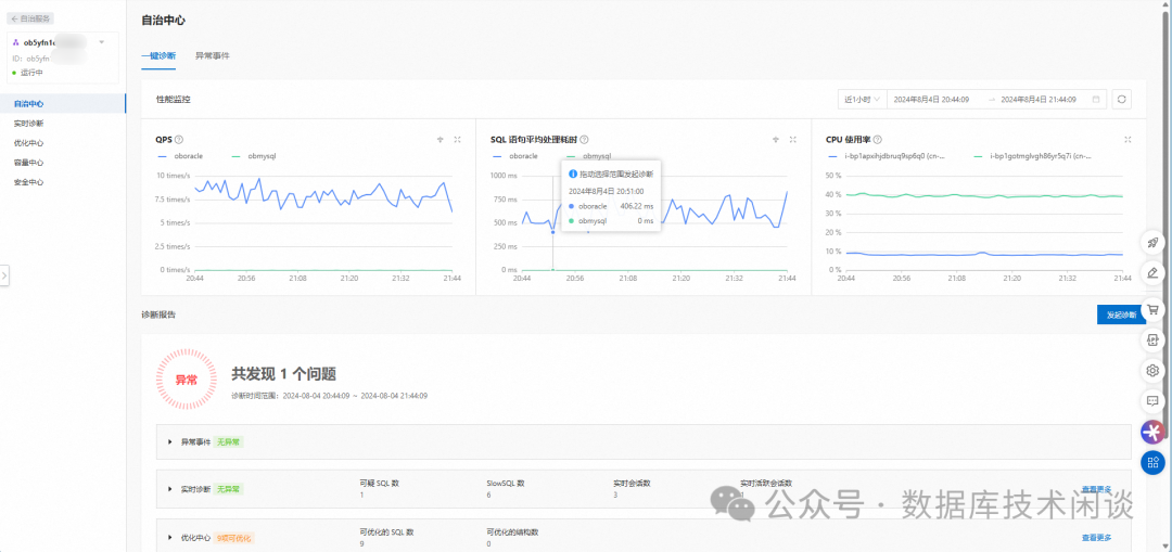 云产品由于不对用户开放运维接口,所以用户也省心。但是有问题发生的时候,用户也失去了从产品底层分析问题的可能行。OBCloud 实例也是如此,当使用出现问题的时候,用户不能查看 OBServer 或 OBProxy 日志。只能提工单去解决。不过 OBCloud 有专人 7x24 小时值班处理用户工单,所以这个问题也不大。平时接触最多的还是性能方面的。OBCloud 实例控制台提供集群、主机和租户层面的各种监控指标,这些指标跟线下 OCP 里的监控指标基本相同。OBCloud 控制台还特意丰富了自助诊断服务的能力,方便用户发现问题 SQL,分析 SQL 的执行计划等,并提供 SQL 快速限流、执行计划绑定。