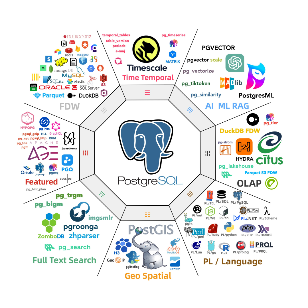 •PG OLAP 分析能力史诗级加强:DuckDB 1.0.0,DuckDB FDW,以及 PG Lakehouse,Hydra 移植至 Deb 系统中。•PG 向量检索与全文检索能力加强:Vectorscale 提供 DiskANN 向量索引,Hunspell 分词字典支持,pg_search 0.8.6。•帮助 ParadeDB 解决了软件包构建问题,现在我们在 Debian/Ubuntu 上也能提供这一扩展。•Supabase 所需的扩展在 Debian/Ubuntu 上全部可用,Supabase 现在可在全OS上自托管。•提供了场景化预置扩展堆栈的能力,如果您不知道安装哪些扩展,我们准备了针对特定应用场景的扩展推荐包(Stack)。•针对所有 PostgreSQL 生态的扩展,制作了元数据表格、文档、索引、名称映射,针对 EL与Deb 进行对齐,确保扩展可用性。•为了解决 DockerHub 被 Ban 的问题,我们加强了 proxy_env