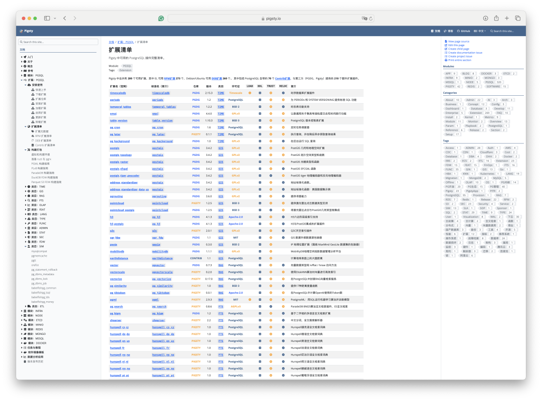 与此同时,我还着手建设了一个扩展元数据库,将 PG 生态的扩展信息收录其中,进行分类,打标,归档,建立信息页,让用户在选用扩展时能更为方便省心。