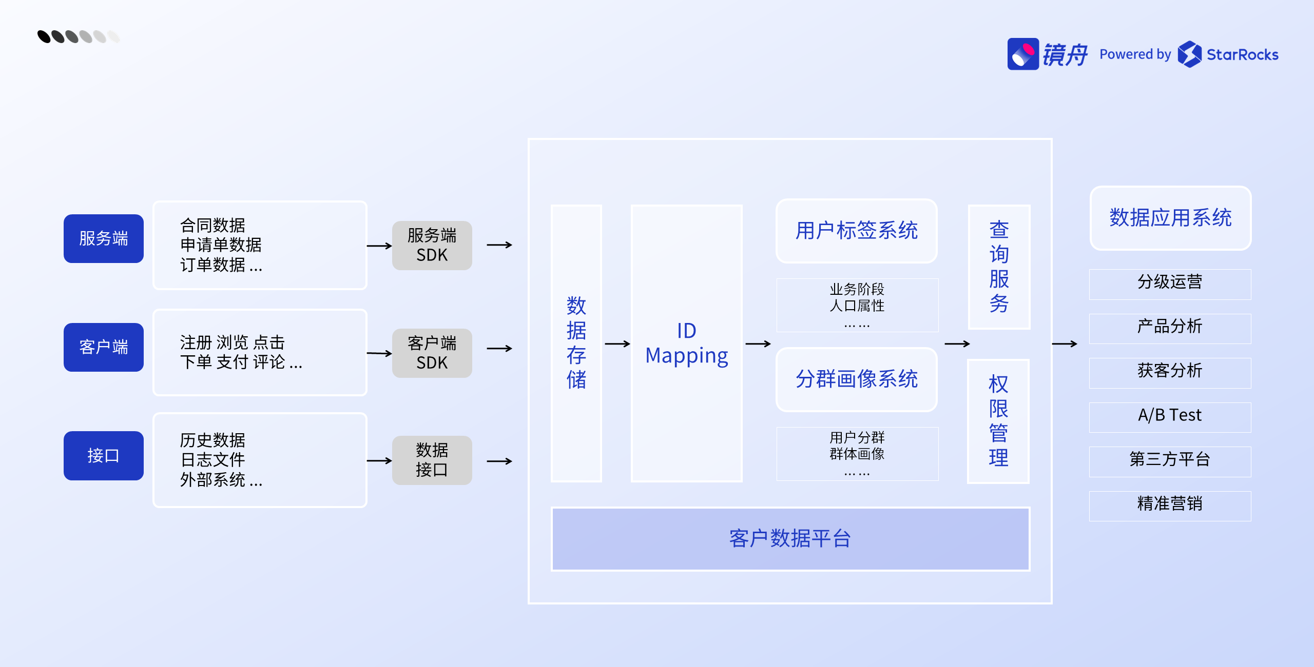 该银行利用镜舟分析型数据库,对用户特征、行为日志和画像标签进行整合,通过镜舟分析型数据库的 Bitmap 能力,可大幅节省存储空间,并实现任意维度的圈选和计算,构建人群包帮助上层应用进行营销策略精准投放,实现了数倍的性能跨越,提升营销活动的精准度和转化效果。
