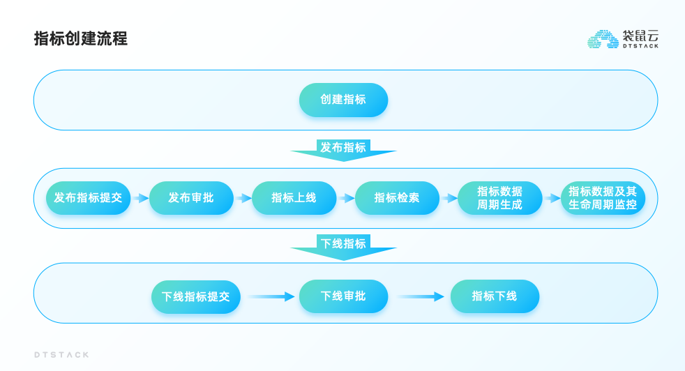 指标的生命周期管理涉及创建、审批、上线、监控、下线等环节。