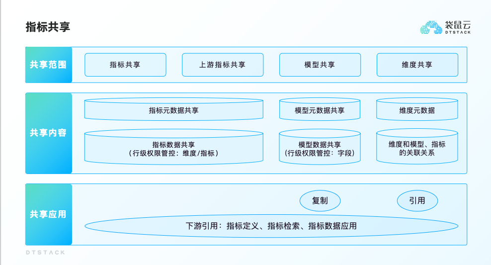 企业级指标协同管理主要通过指标共享功能实现。例如,在集团和分公司结构中,集团需要汇总各分公司的数据进行统一管理,生成共性结果下发给分公司进行二次生成。指标共享包括指标共享、上游指标联动共享、模型共享和维度共享四大部分。