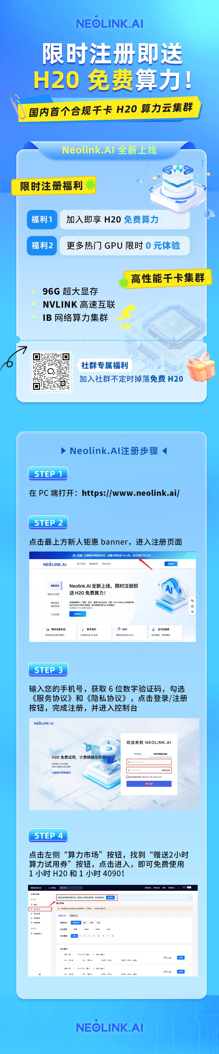 今天,我们在 Neolink.AI 上架了国内首个合规千卡 H20 算力云集群,具备 96G 超大显存,NVLINK 高速互联、IB 网络算力集群等高性能集群优势,目前推出注册即送免费算力活动,快来尝鲜!