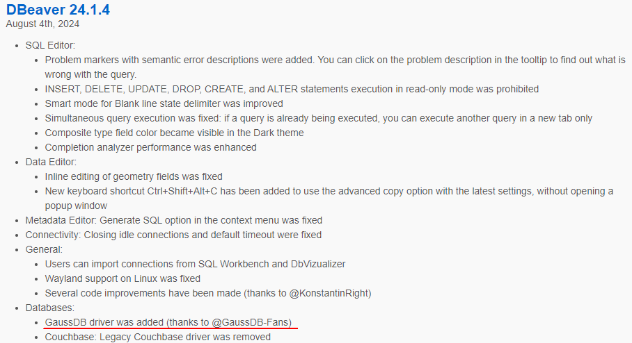 24.1.4版本对GaussDB的原生支持,无论是数据库管理员,还是数据库开发者,都将从中获益,提升工作效率。欢迎大家下载并体验DBeaver 24.1.4版本,探索GaussDB的无限可能,并与GaussDB携手前行,共创更美好的数据库未来!