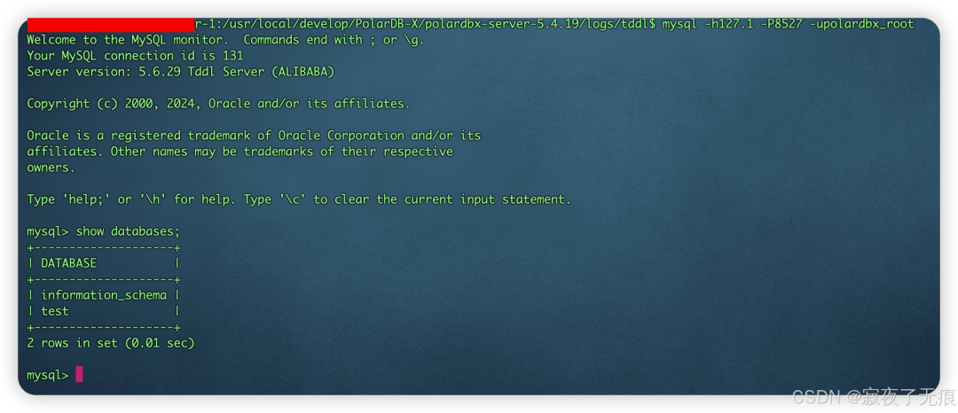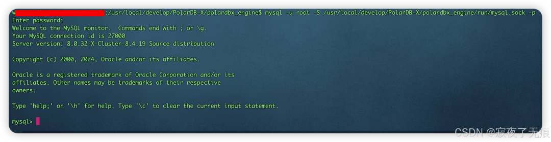 # 指定socket连接 密码为空 直接回车就行mysql -u root -S /usr/local/develop/PolarDB-X/polardbx_engine/run/mysql.sock -p
