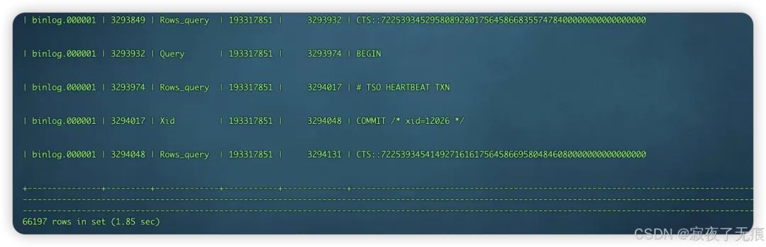 mysql -h127.1 -P8527 -upolardbx_rootshow binary logs;# 这个事件会有很多show binlog events;
