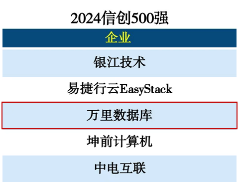 近日,中国科学院《互联网周刊》联合德本咨询、中科院信息化研究中心、eNet研究院共同发布“2024中国信创500强”榜单。万里数据库凭借领先的自主研发能力、创新产品技术成果、深厚行业实践,以及在信创市场的长期耕耘,连续4年跻身《中国信创500强》榜单,充分证明了万里数据库在国产数据库信创领域的市场地位与技术实力。