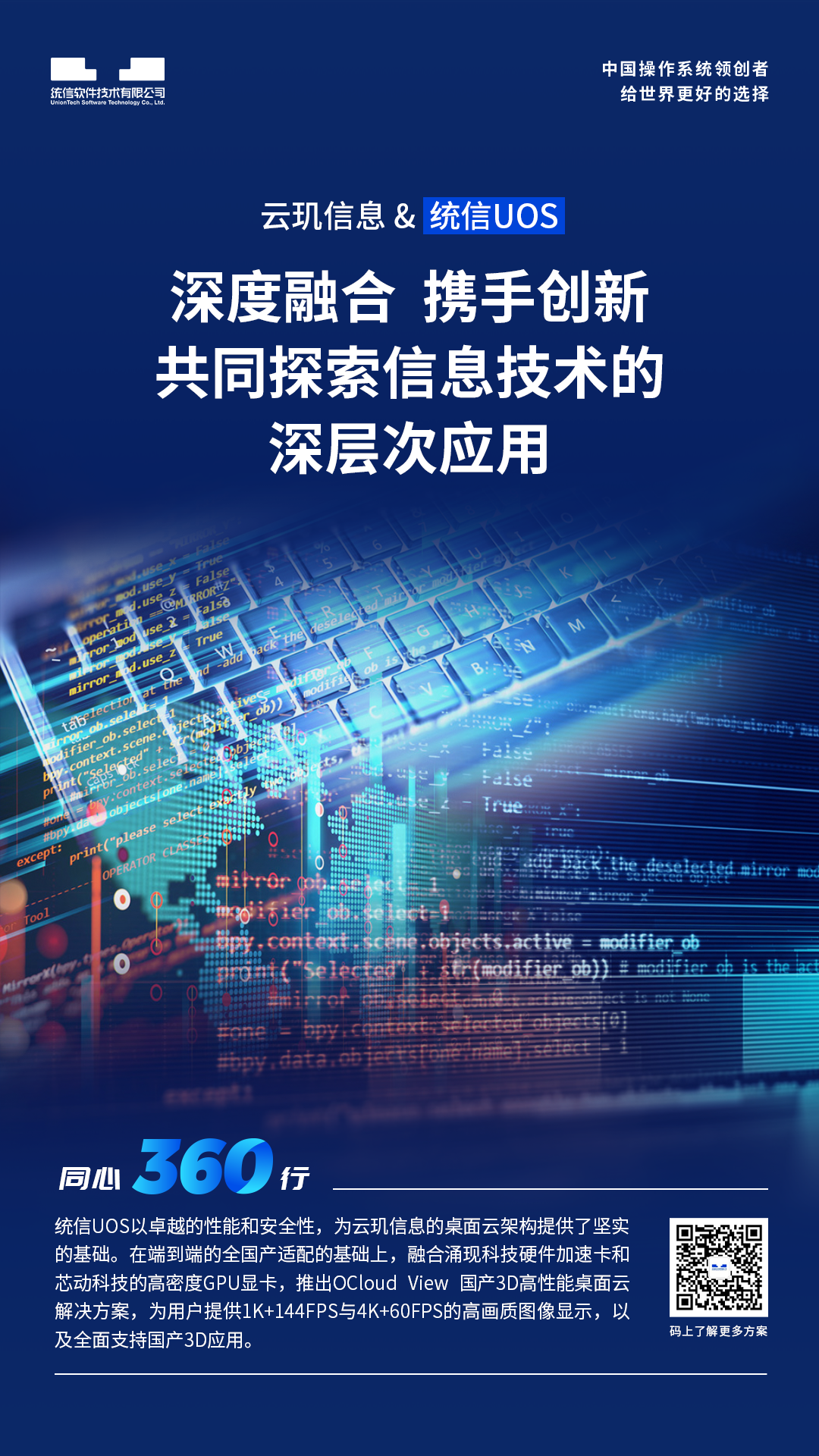 作为国内自主研发的操作系统,统信UOS以其卓越的性能和安全性,为云玑信息的桌面云架构提供了坚实的基础。此次双方携手合作,共同探索信息技术的深层次应用,共同推进国产高性能桌面云产品的发展,为用户提供高效、安全、稳定的云计算解决方案。